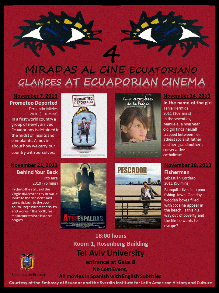 מכון סברדלין להיסטוריה ותרבות של אמריקה הלטינית בשיתוף עם שגרירות אקוודור בישראל, עורכים סדרת הקרנות של סרטים אקוודוריאניים עכשווים, הפתוחה לציבור הרחב.